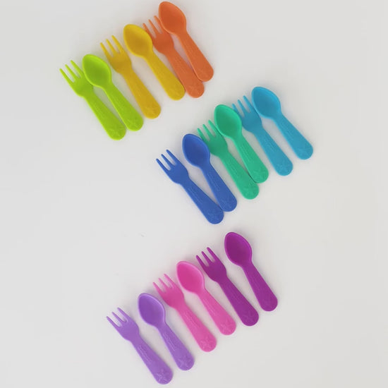 Gata cu degetele murdare :) Setul de furculiță și lingură Lunch Punch se potrivește perfect în cutiile de prânz Yumbox și Montiico Bento și adaugă culoare gustărilor tale.
