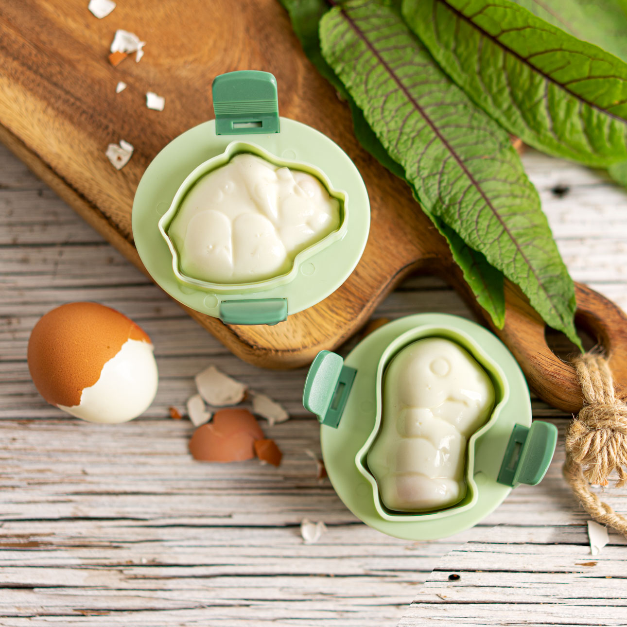 Cu ajutorul matrițelor pentru ouă, oul fiert va deveni două tipuri de dinozauri (T-Rex, Triceratops).